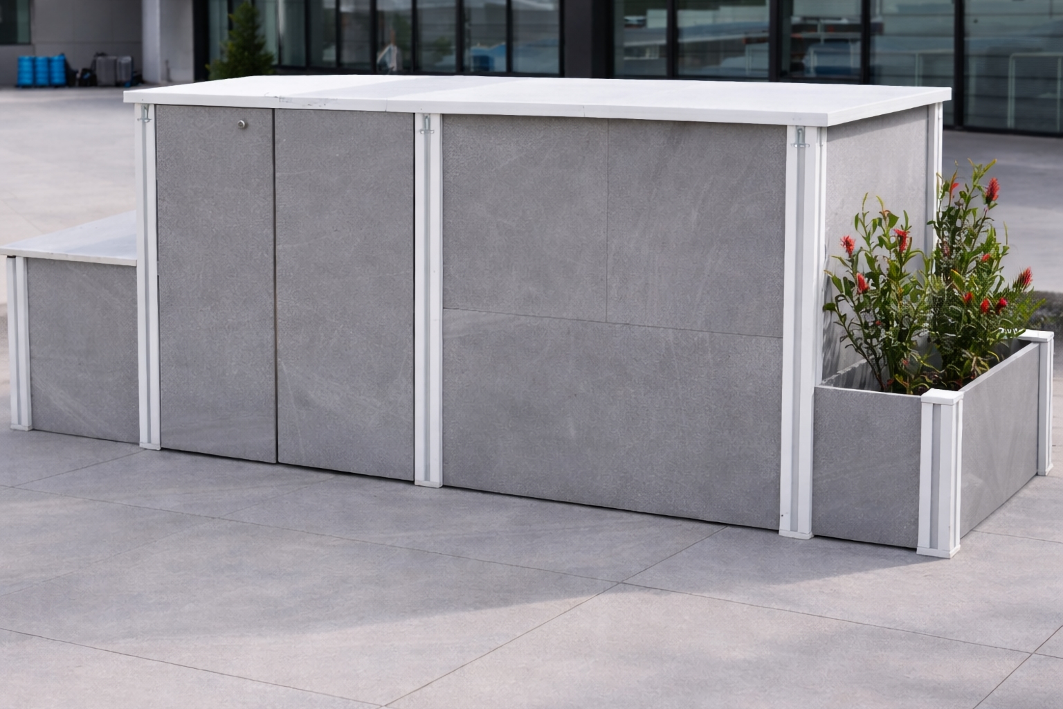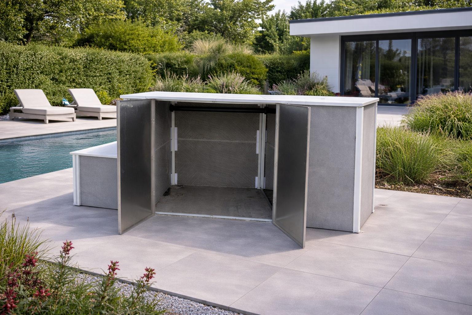 Le Local Technique est la solution idéale pour intégrer proprement l’ensemble de l’installation piscine, tout en apportant une touche esthétique au jardin. Conçu en grès cérame et aluminium laqué, il combine résistance, élégance et modularité.